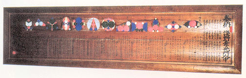 Sau đó một người, có lẽ là một võ sĩ samurai khánh kiệt, nhận ra ngựa và lợn không phải là những thứ duy nhất có thể được vẽ trên một tấm bảng. Ông nảy ra ý tưởng vẽ một thứ thật nguyên bản, thật đẹp đẽ, một thứ thật sáng tạo. Và ông đã dâng lên thần linh môn toán học. Hàng trăm bảng gỗ được sơn đẹp đẽ trên đó có những bài toán và các định lý hình học được dùng để trang hoàng những ngôi đền Nhật. Chúng được gọi là “sangaku”, đơn giản nghĩa là các bảng toán học. Ký tự trên các bảng là một dạng chữ Trung Quốc cổ, loại ngôn ngữ của các học giả, tương tự như chữ Latin ở phương Tây. Những bảng này chỉ mới được dịch sang những ngôn ngữ hiện đại trong vài mươi năm gần đây. ![]() Tấm sangaku này được treo trong đền thờ Kinshouzan thuộc quận Gifu vào năm 1865. Trên đó là 12 bài toán hình học khác nhau. Bài toán thứ 3 từ bên phải sang là do một thiếu nữ 16 tuổi đưa ra.