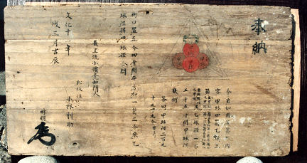 Rothman cho biết “Sangaku thật độc đáo. Chúng không chỉ đặc biệt đẹp mà những bài toán trên đó cũng thường đặc biệt khó. Và lời giải có thể rất thông minh. Một số những bước người ta dùng để giải các bài toán đó tôi chưa từng biết đến.” Những tấm sangaku được thực hiện trong suốt giai đoạn Nhật Bản gần như bị cô lập khỏi thế giới bên ngoài. Các nhà lãnh đạo shogun (tướng quân) đã trục xuất các nhà truyền đạo nước ngoài và cấm dân Nhật rời khỏi đất nước khoảng đầu thế kỷ 17. Kết quả là một giai đoạn phục hưng diễn ra ở Nhật cùng với sự nở rộ những truyền thống văn hóa độc đáo như trà đạo, sân khấu rối và in trên khối gỗ. ![]() Tấm này được tạo ra vào năm 1814 nhưng người ta chỉ phát hiện ra nó vào năm 1994 khi ngôi đền cất giữ nó sắp bị phá hủy.
