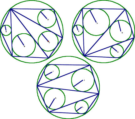 Một tấm sangaku cho thấy tổng số các bán kính của các đường tròn nhỏ trong mỗi hình vẽ này đều bằng nhau.